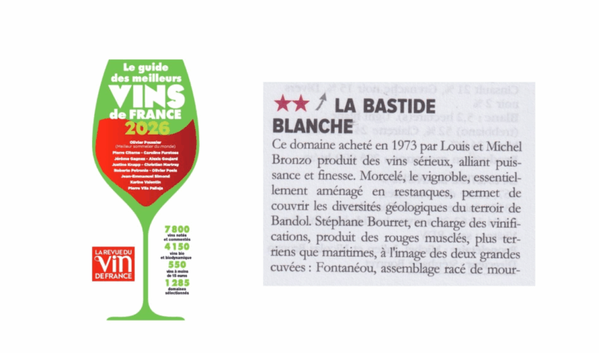 Le Domaine de la Bastide Blanche en agriculture biodynamique (biodyvin) à Bandol franchit un nouveau cap dans le Guide 2025 de La Revue du Vin de France : il passe de 1 à 2 étoiles. Une reconnaissance qui souligne la fidélité à une identité et à une exigence de long terme.